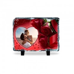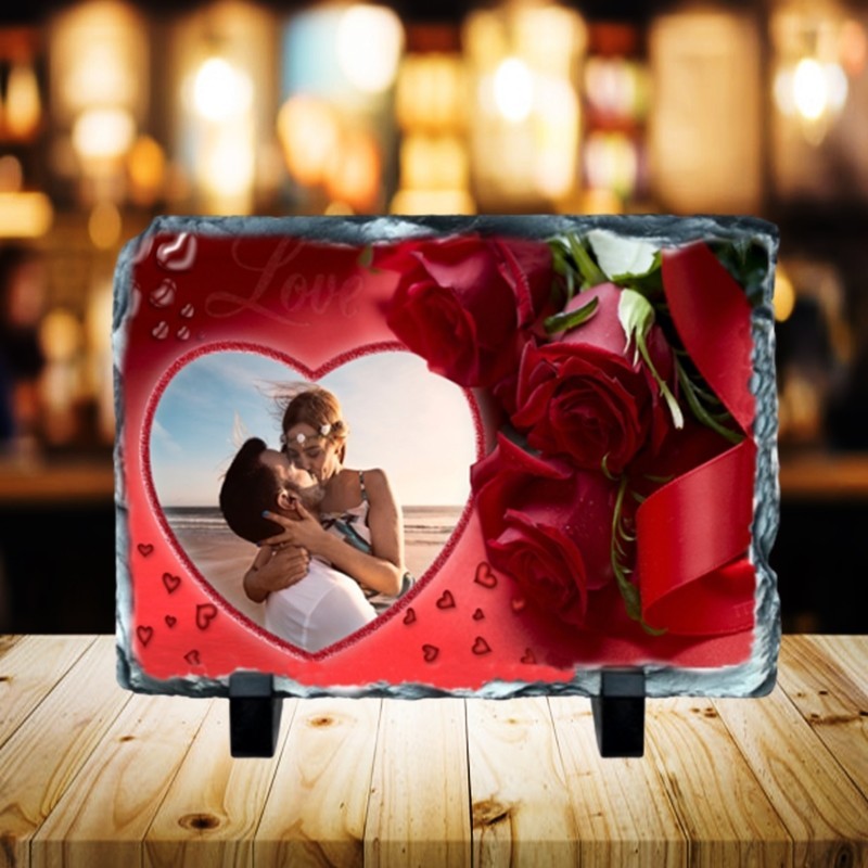 Piatră ardezie personalizată cu o poză în formă de inimioară și trandafiri roșii. Un cadou special pentru persoana pe care o iubesti și cu care împreună aveți cele mai frumoase amintiri de neuitat. Este un cadou unic pe care îl poți oferi, nu se demodează, iar în timp o sa reflecte amintirile și iubirea care va unit.