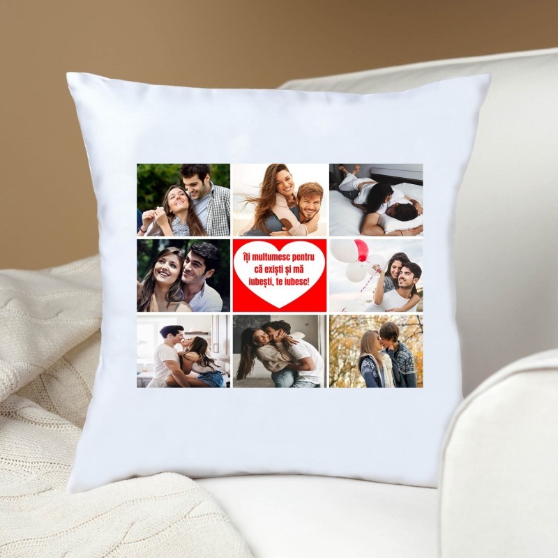 Această pernă personalizată cu 8 poze și mesaj, este un cadou personalizat inedit pentru orice ocazie și pentru cea mai draga persoană din viața ta. Inedită pentru a fi oferită iubitului, iubitei sau unei cunostințe dragi ție. Această perna personalizată este specială deoarece o poți personaliza cu 8 poze și un mesaj de dragoste și nu numai.