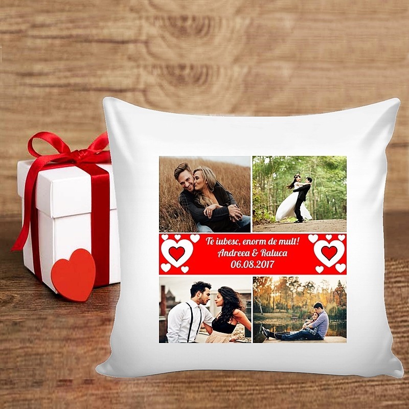 Pernă personalizată cu 4 poze și mesaj, model inimioare, printare la calitate foto premium direct în țesătura materialului pentru ca tu să te bucuri de o pernă personalizată moale, pufoasă și de calitate. Este un cadou personalizat pe care îl poți dărui oricărei persoane dragi din viața ta, un cadou unic, vei merge la sigur și vei impresiona persoana pe care o iubesti.